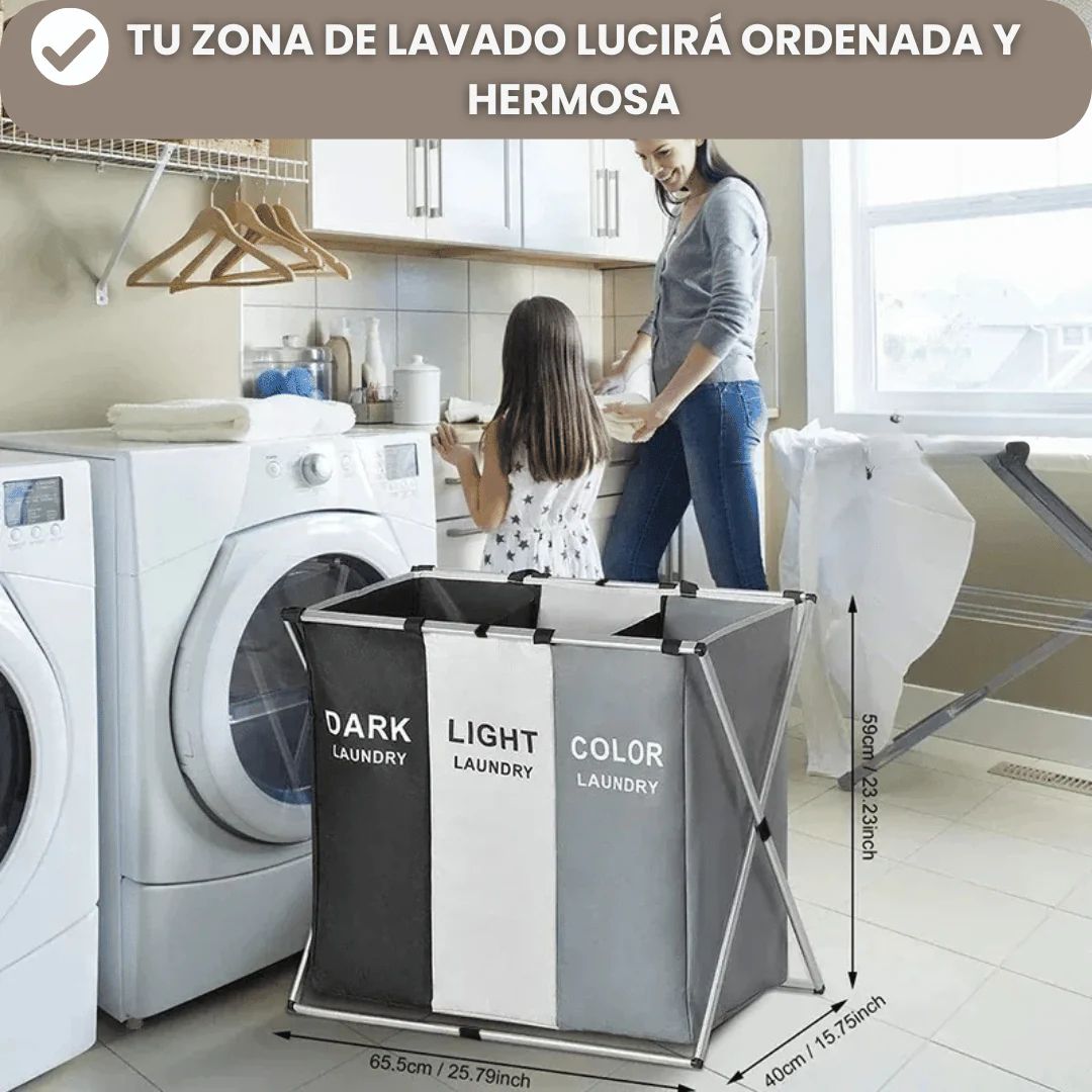 Cesto de ropa sucia con 3 compartimentos para separar blancos, colores y oscuros. Diseño plegable, resistente y fácil de transportar. ¡Más orden y menos estrés en tu hogar!
