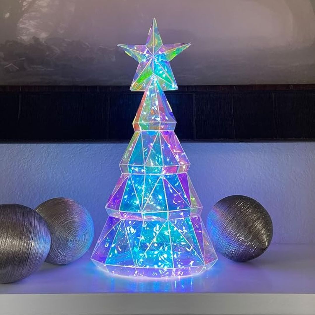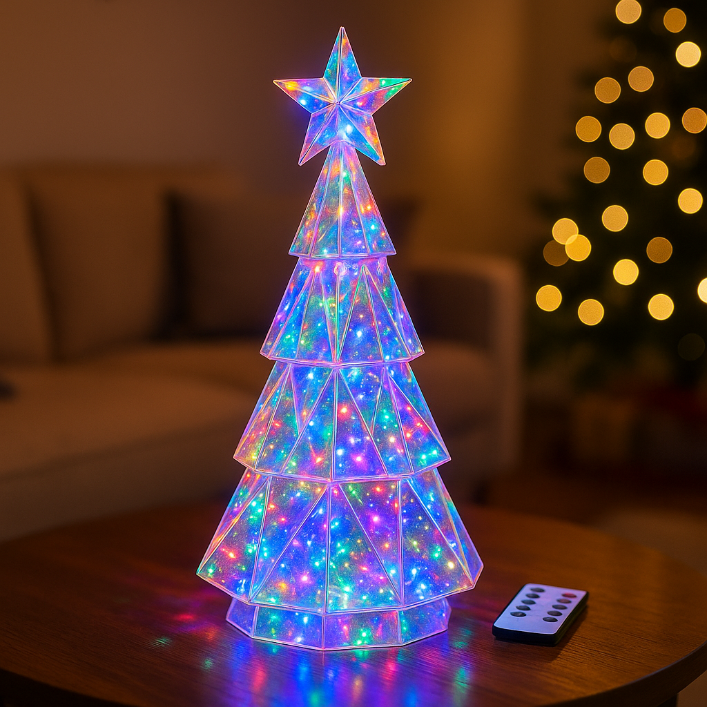 El árbol cuenta con luces LED RGB integradas que se reflejan en paneles acrílicos prismáticos, creando un efecto holográfico de colores cambiantes. Puedes ajustar el modo de iluminación con el control remoto o directamente desde el botón de encendido.