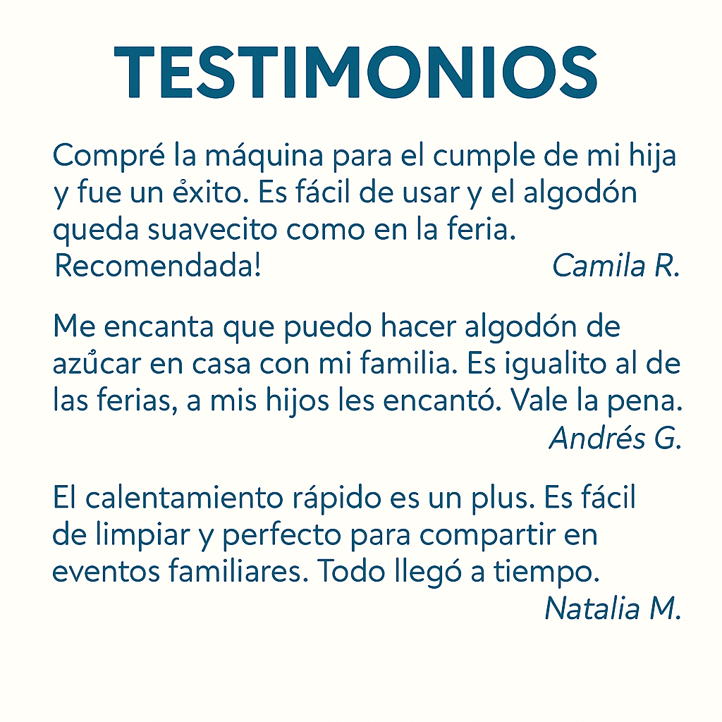 Pensé que iba a ser un producto frágil, pero me sorprendió la calidad. El cuerpo es resistente y el algodón sale igual que en las ferias. La compré para usarla en mi emprendimiento de eventos y fiestas infantiles, y ha sido un éxito.