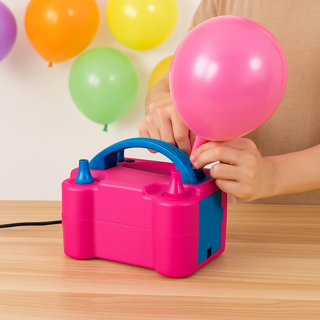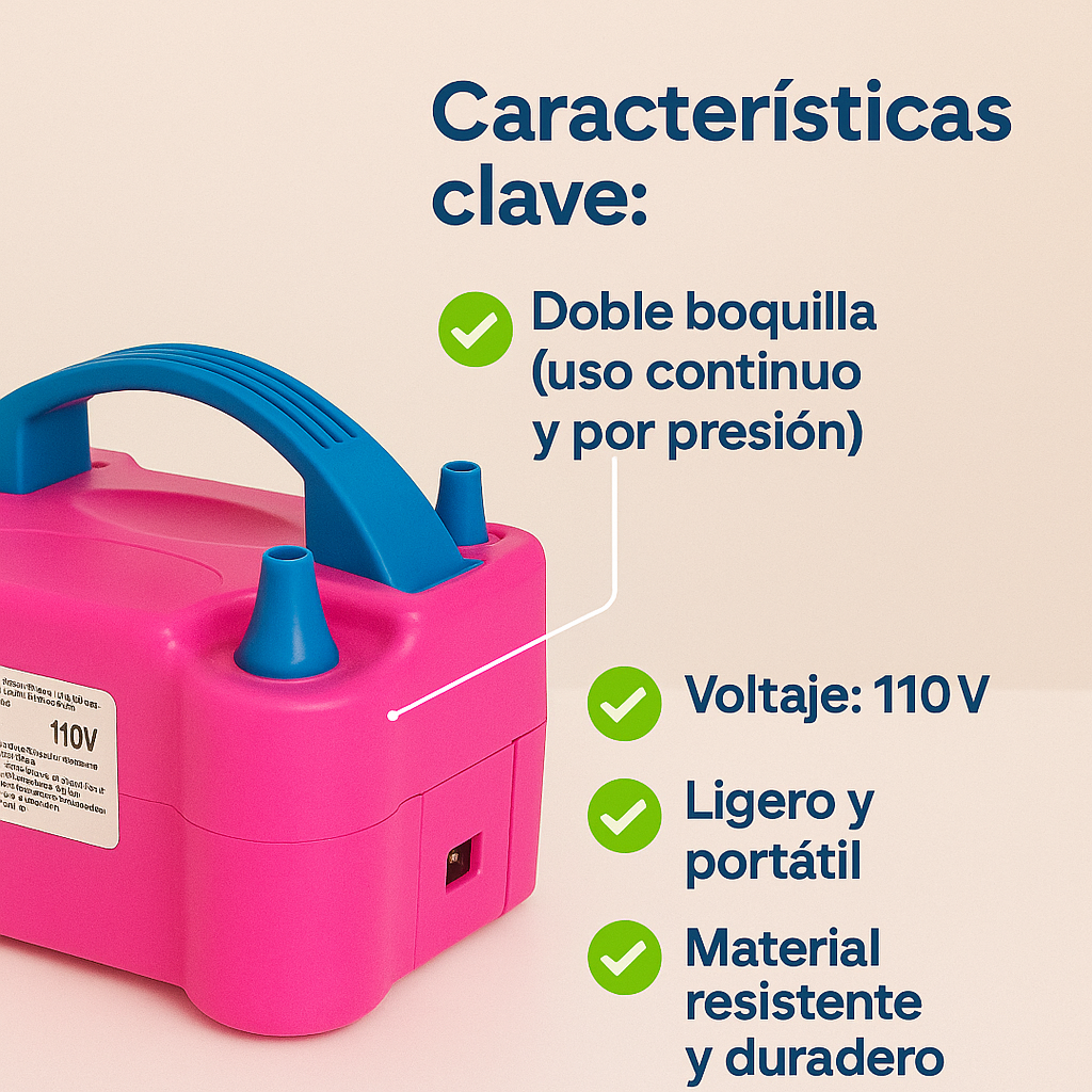 Es muy sencillo. Solo conecta el inflador a una toma de corriente, coloca el globo en la boquilla y presiona suavemente hacia abajo para activar el flujo de aire. En segundos tendrás tu globo listo.
