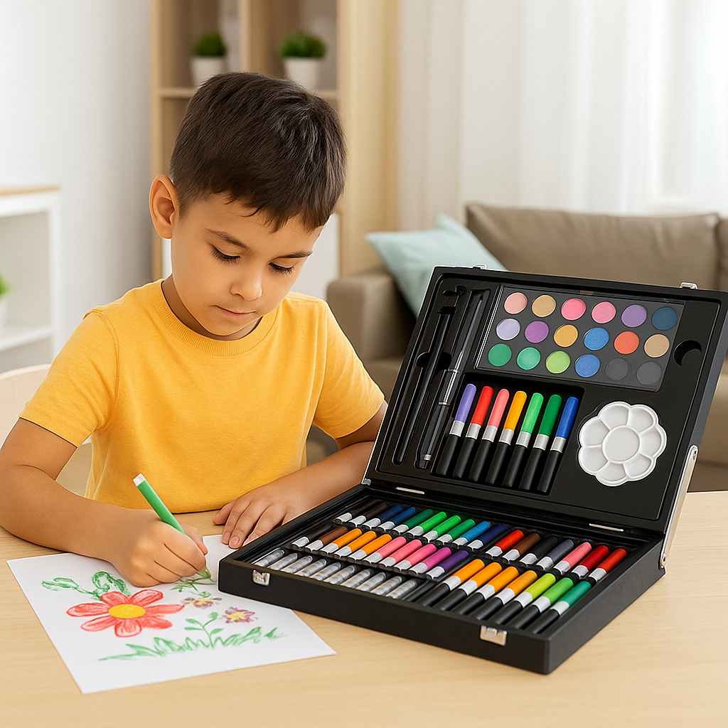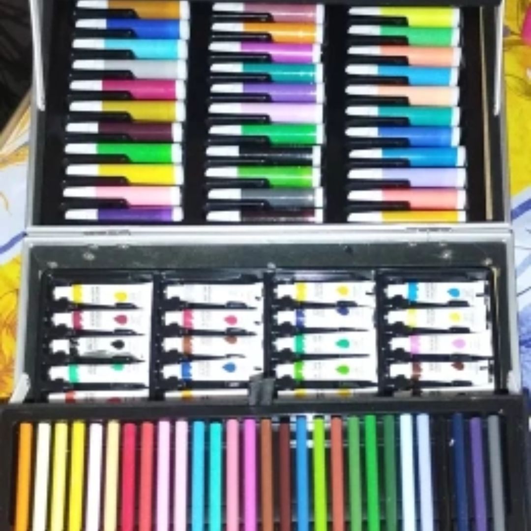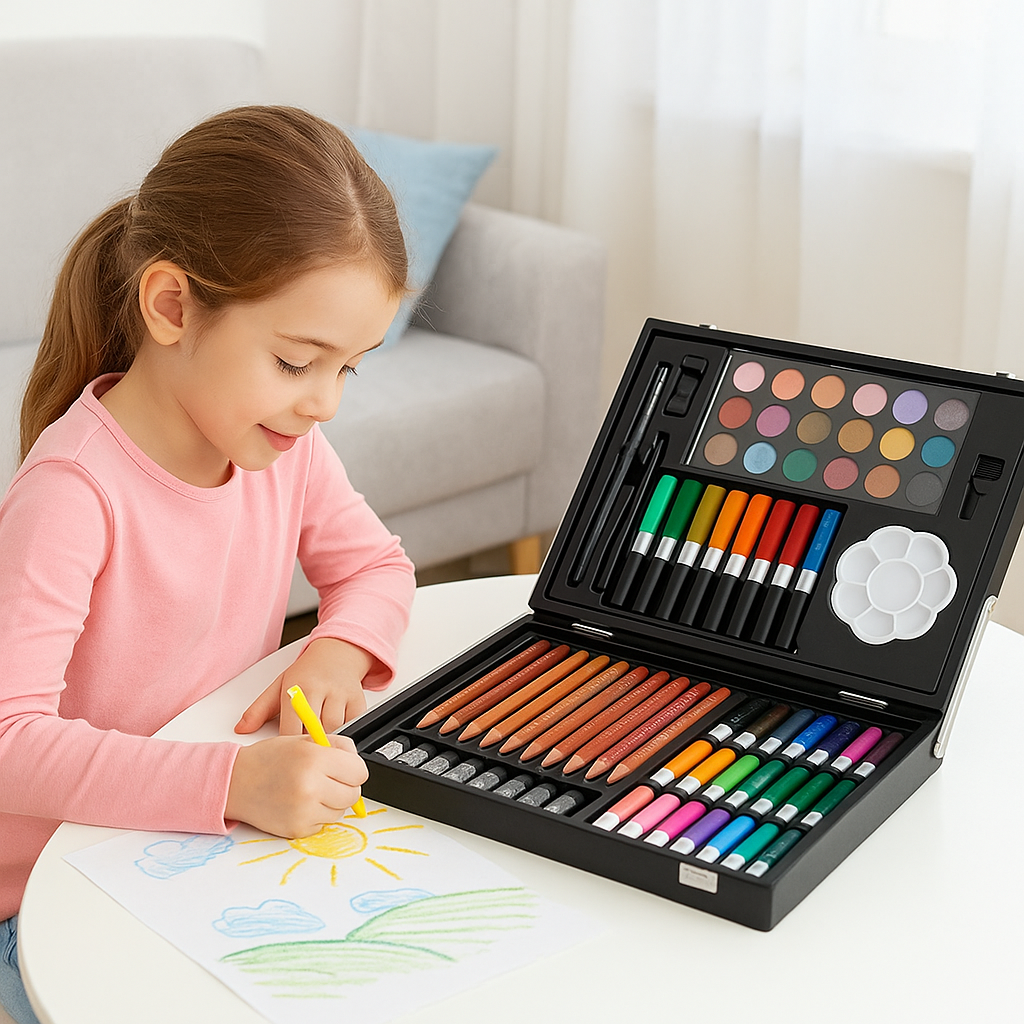El kit incluye lápices de colores, acuarelas, pasteles al óleo, marcadores, pinceles, paletas de plástico, borradores, sacapuntas y más.