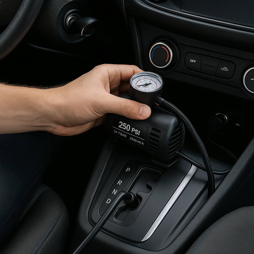 • Conéctalo al carro:Inserta el enchufe del compresor en el encendedor del vehículo (toma de 12V).