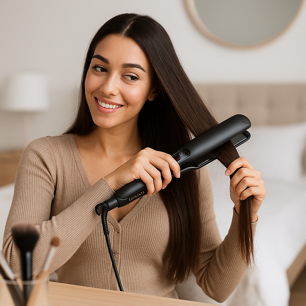 Logra un alisado perfecto en menos tiempo, gracias a sus placas de titanio premium que deslizan suavemente y protegen tu cabello.