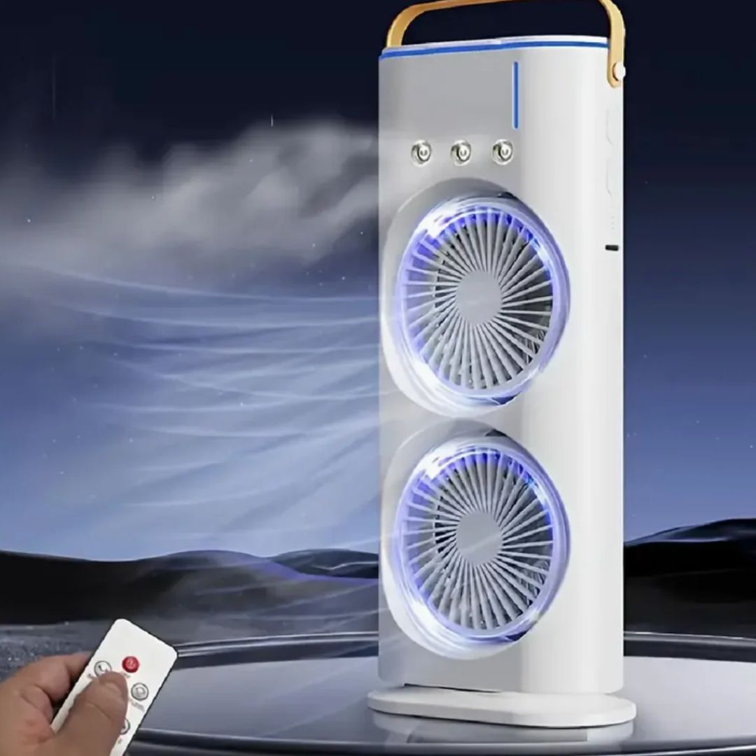 Disfruta de una brisa fresca al momento con este aire acondicionado portátil 3 en 1. Su doble cabezal de pulverización enfría y humidifica tu ambiente rápidamente, brindándote el alivio perfecto en los días calurosos.